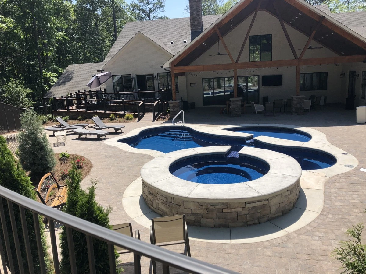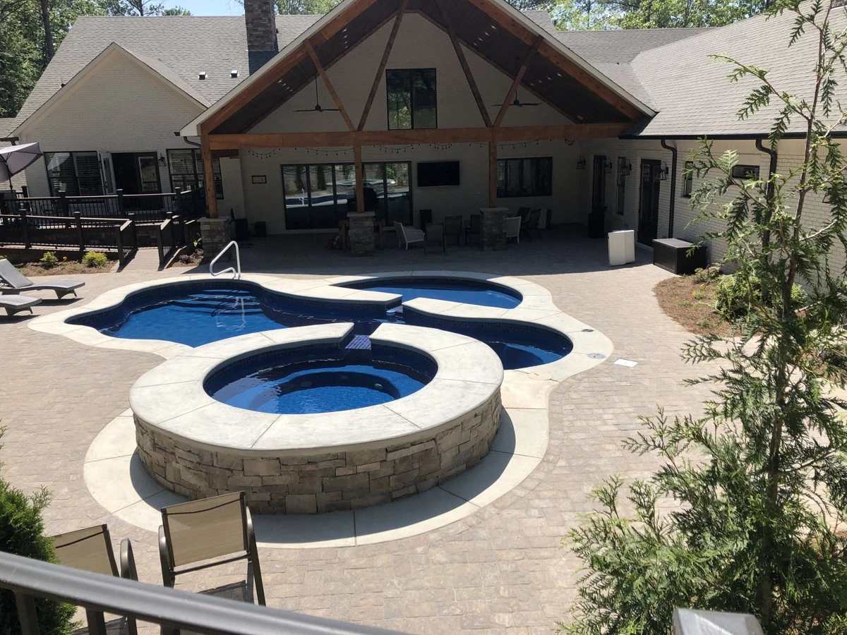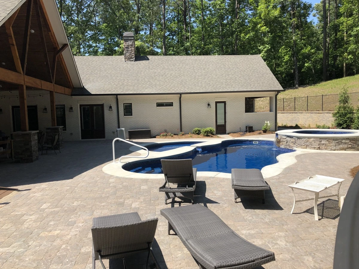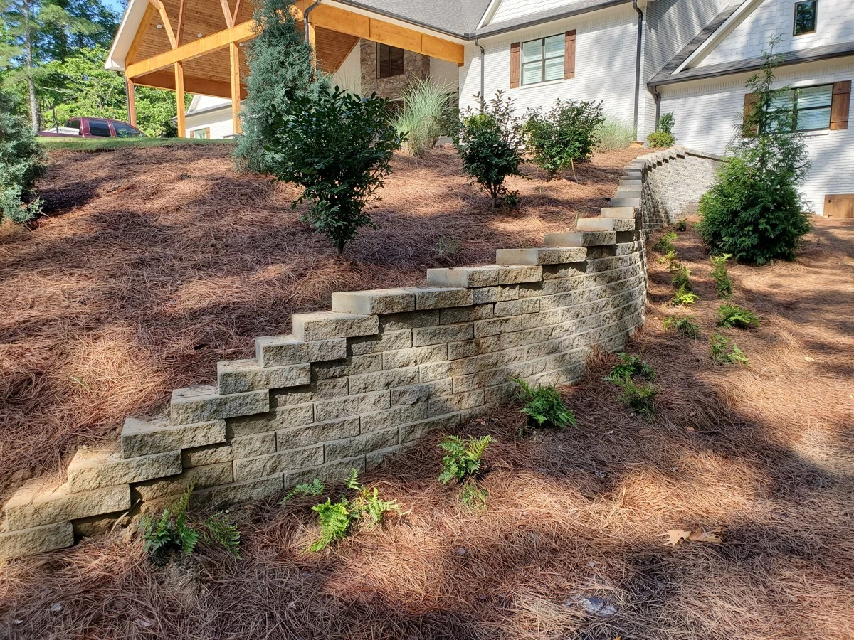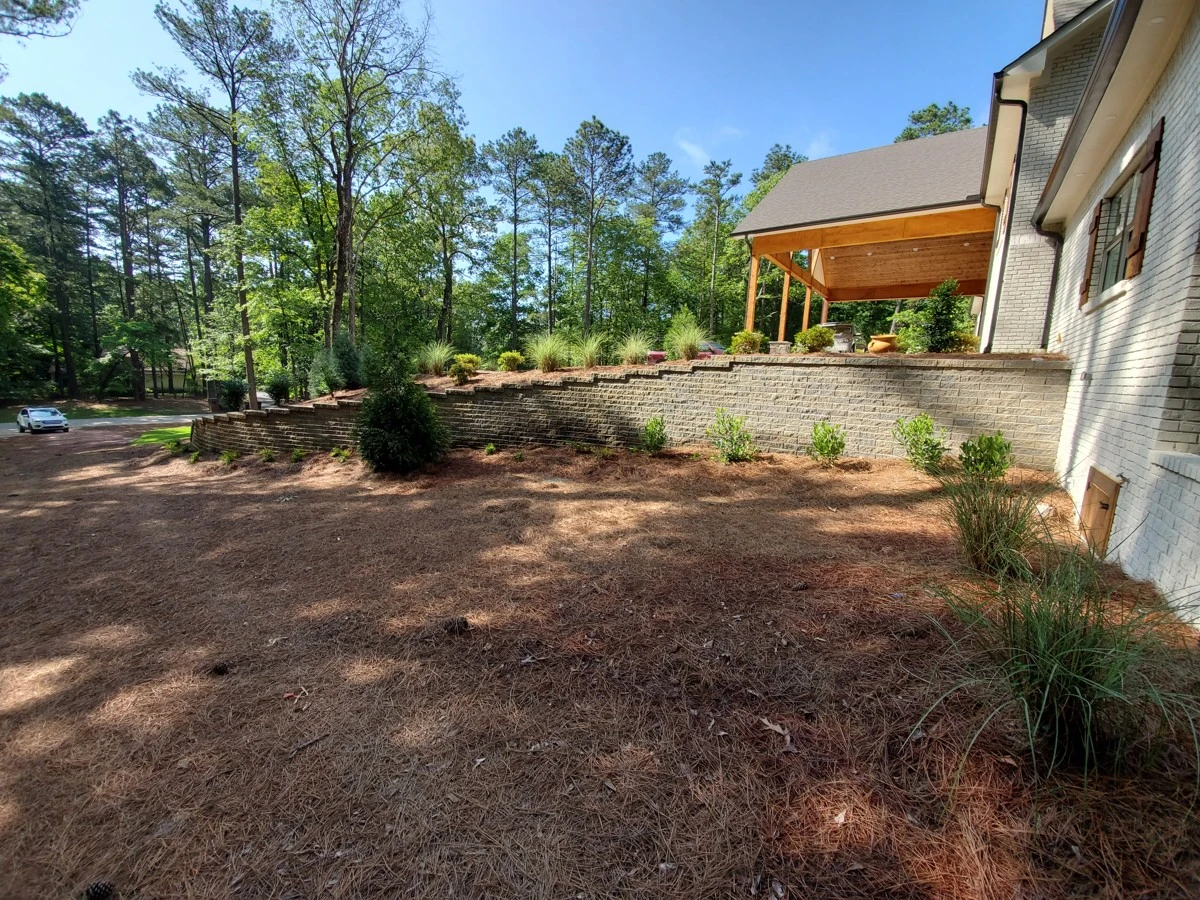 The house was newly remodeled. Before the builder started we were asked to construct this retaining wall. When the house renovation finished, a pool company built the gunite pool with spa. Dirtworks and Bobcat Service installed the pavers around the pool, retaining walls up front of the house, sod, pine straw and all the plants and trees.