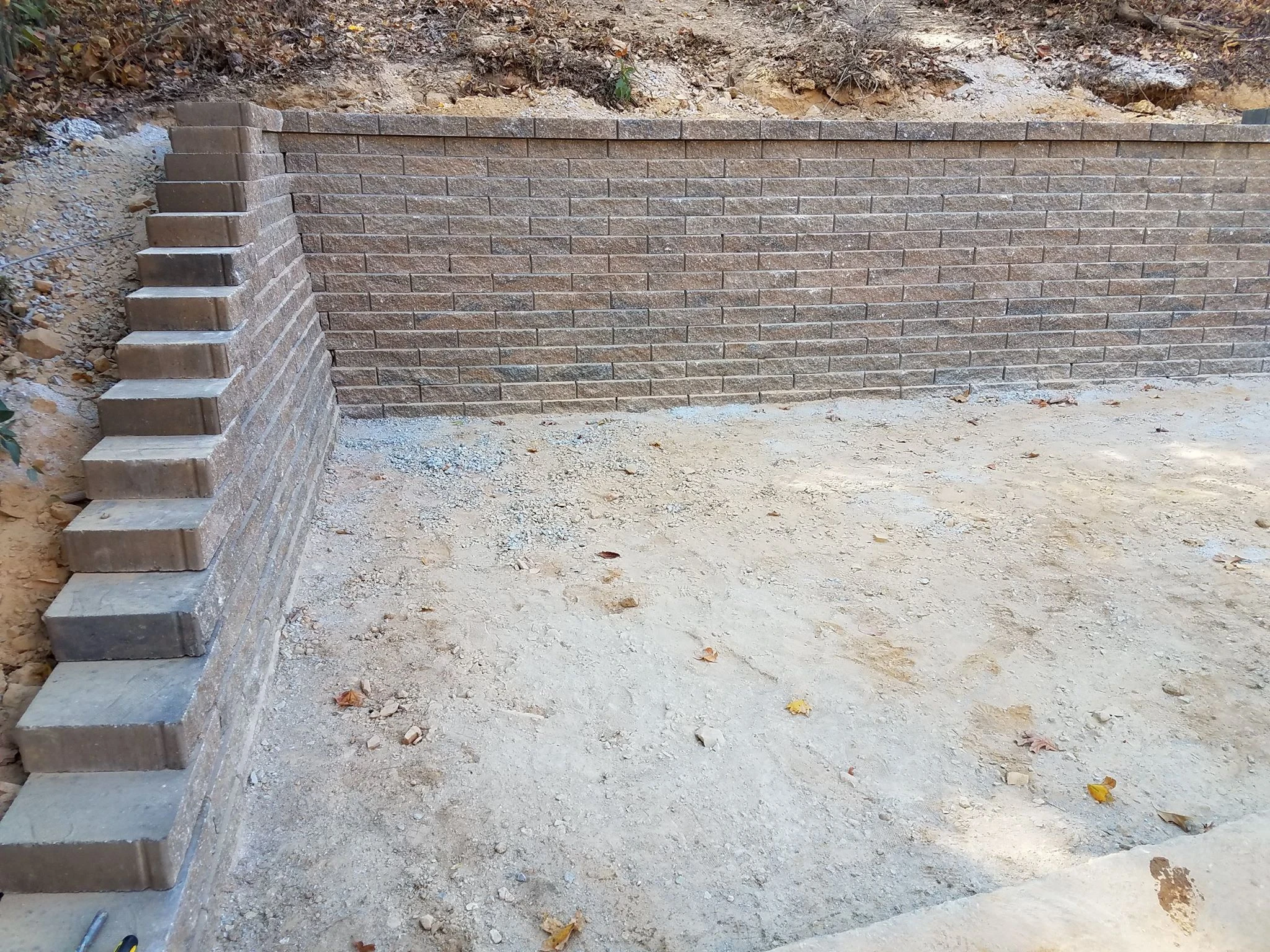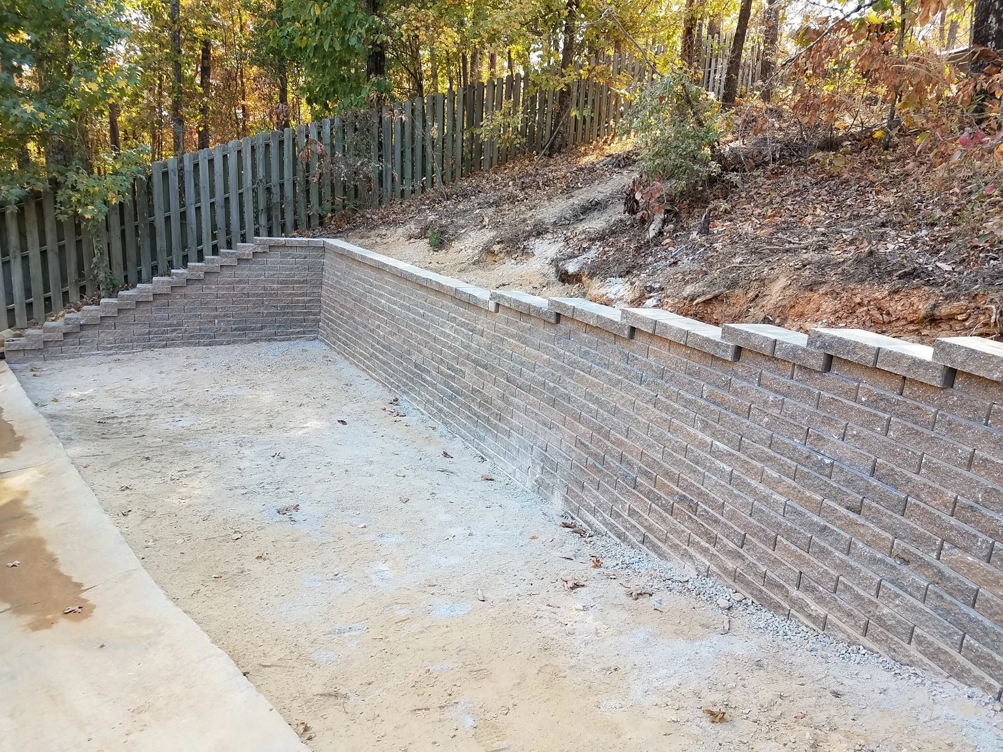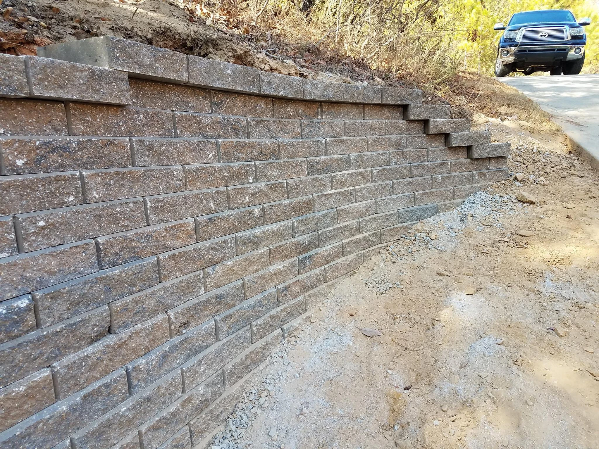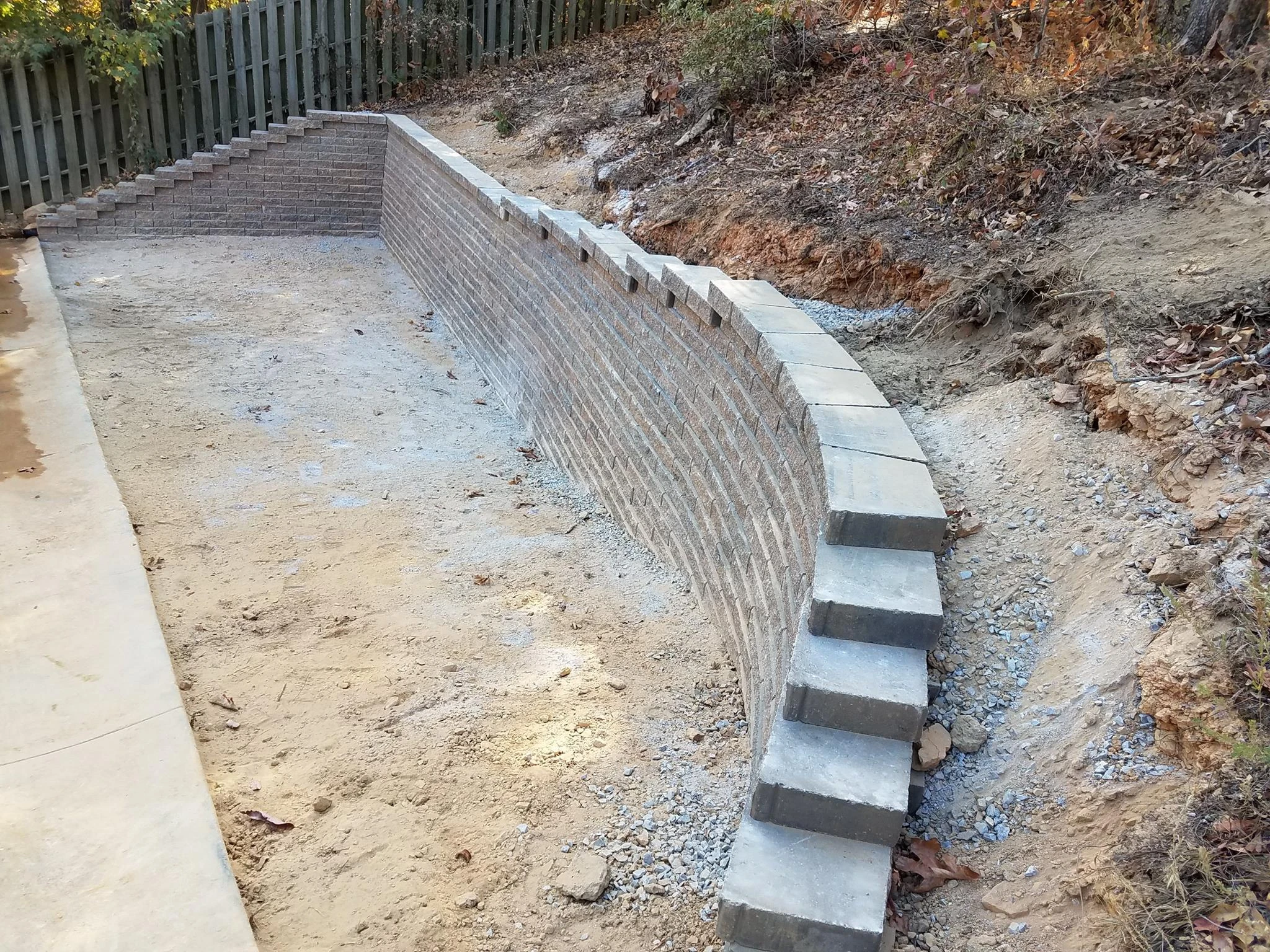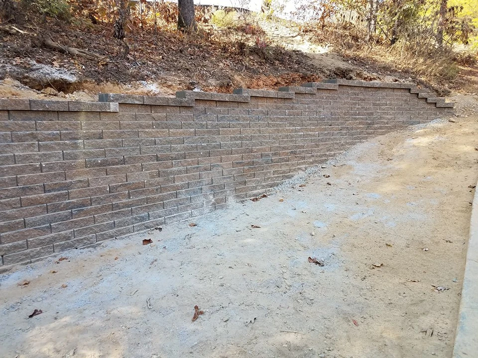 The purpose of this 55 ft long and 4.5 ft tall retaining wall was to create additional parking area for a growing family in Helena, Al. We used 495 Geo stone blocks, 16 tons of #57 gravel, and installed 55 ft of french drain.