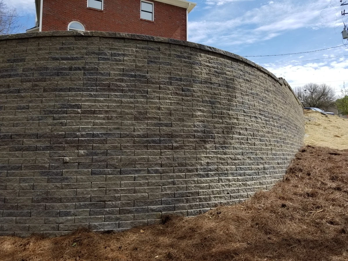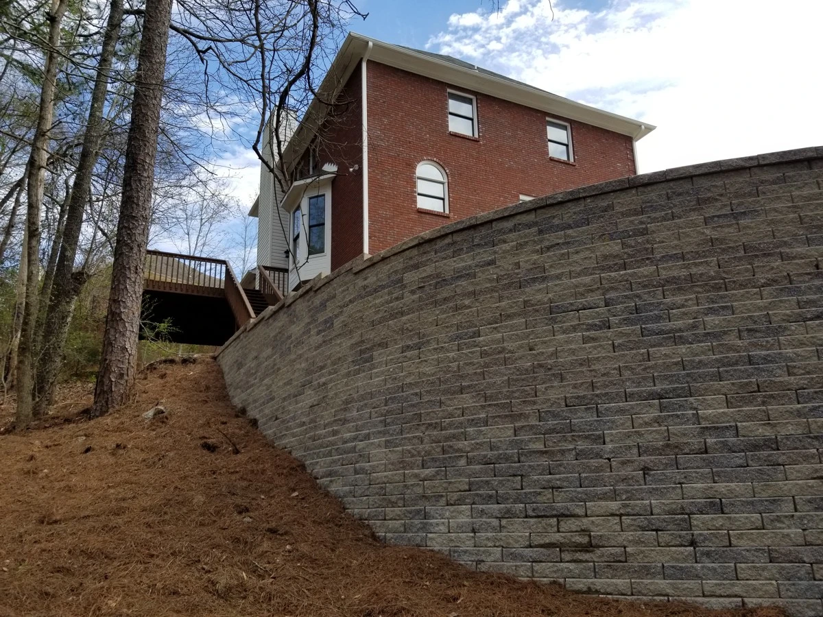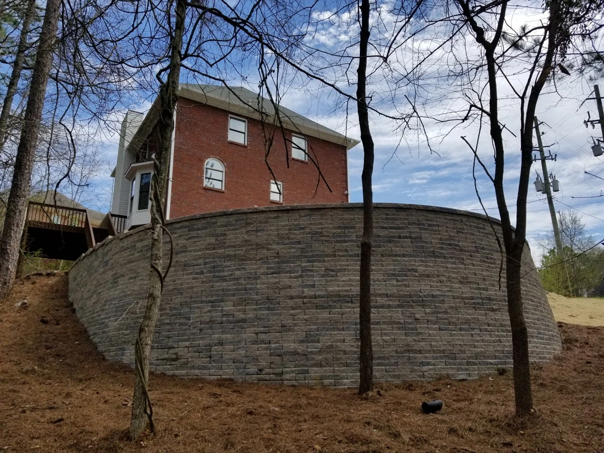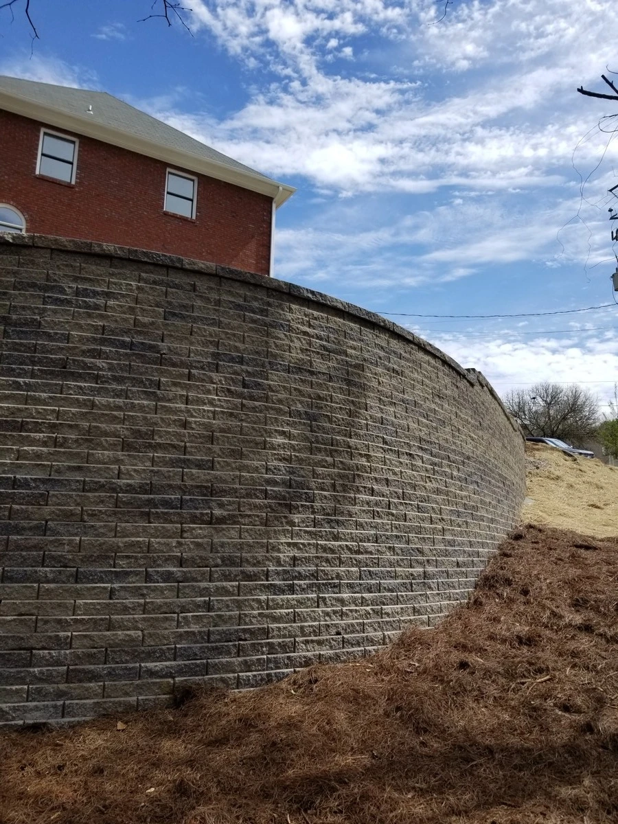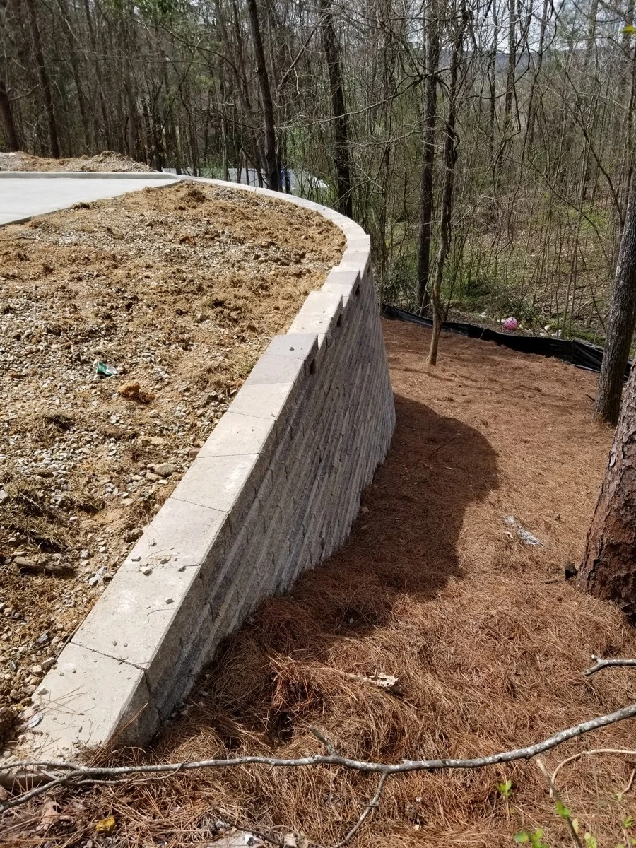 Dirtworks and Bobcat Service constructed this retaining wall. We removed vegatation beneath the existing wall and hauled off the property.  We excavated the footings for the wall, installed 4' drain on inside-bottom of wall. The wall is constructed from GeoStone material, it is 12' tall and 95' long.