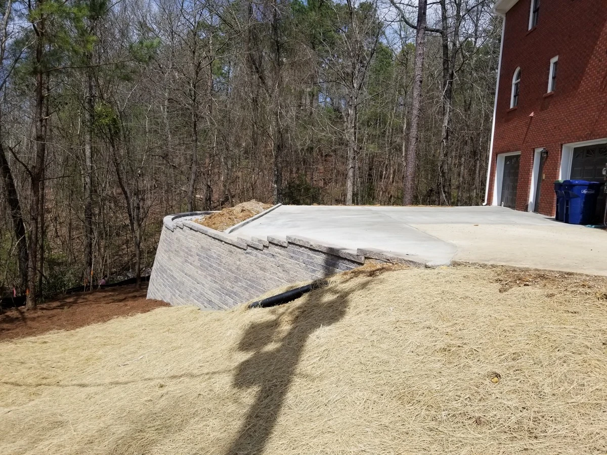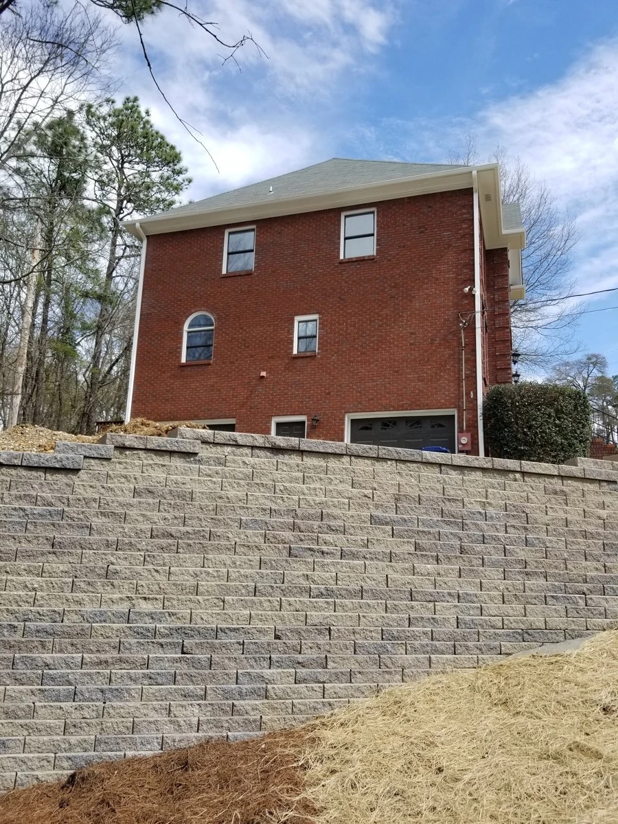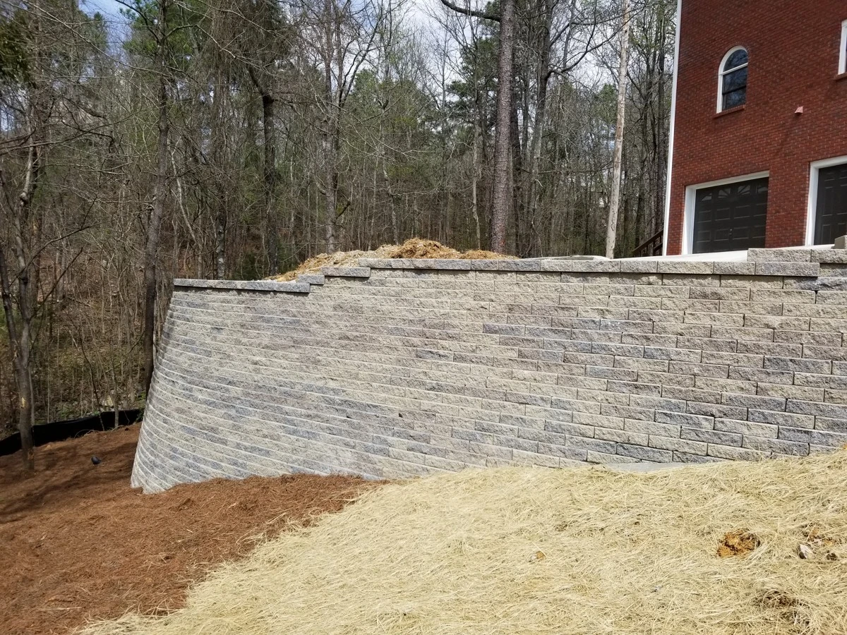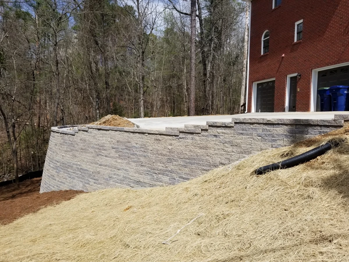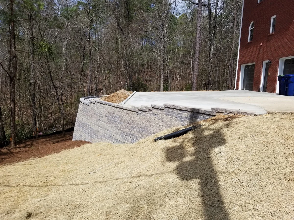 Dirtworks and Bobcat Service constructed this retaining wall. We removed vegatation beneath the existing wall and hauled off the property.  We excavated the footings for the wall, installed 4' drain on inside-bottom of wall. The wall is constructed from GeoStone material, it is 12' tall and 95' long.