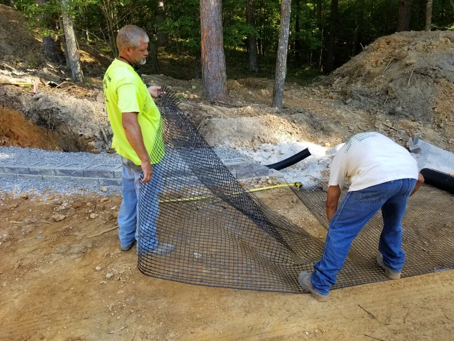 After the first gravel fill we lay down the geogrids. A geogrid is a material utilized to reinforce the soil. It diverts the tension caused by a retaining wall, making the soil stronger.